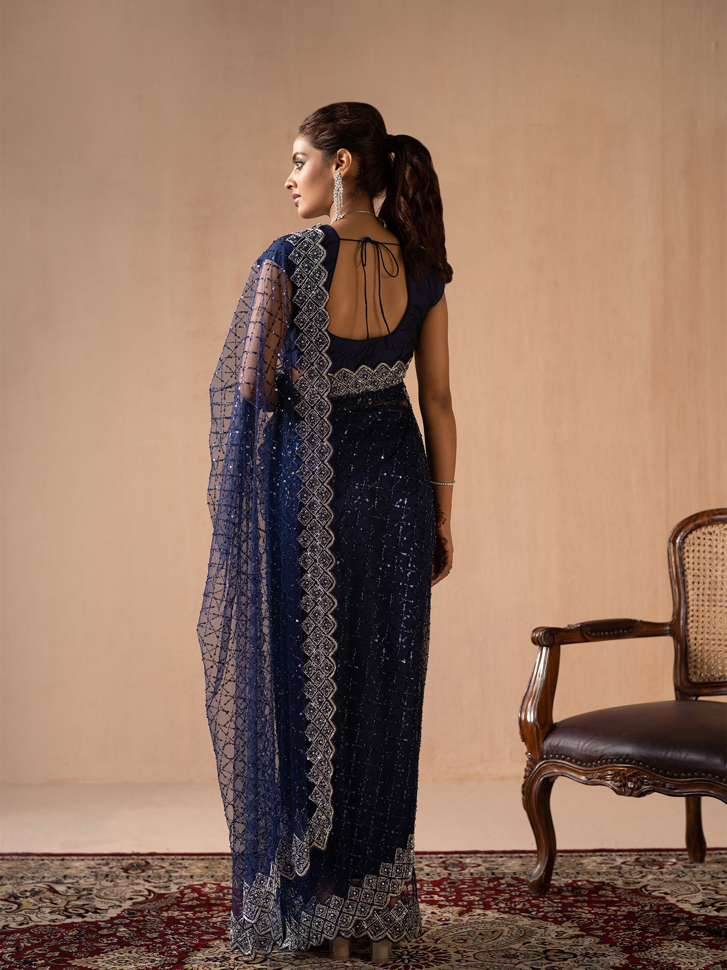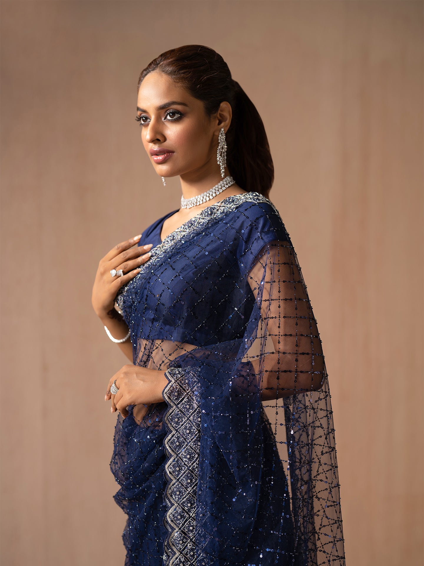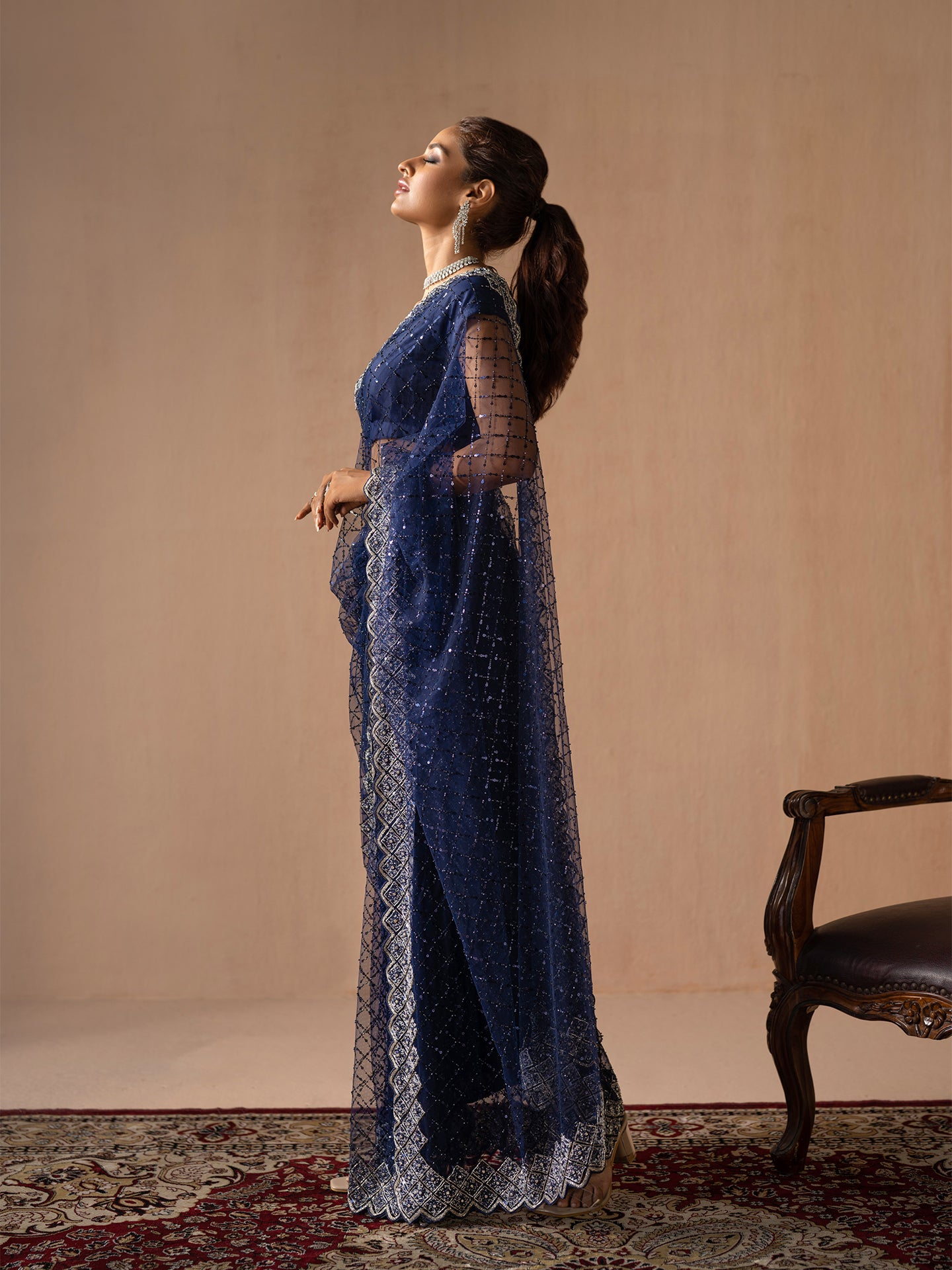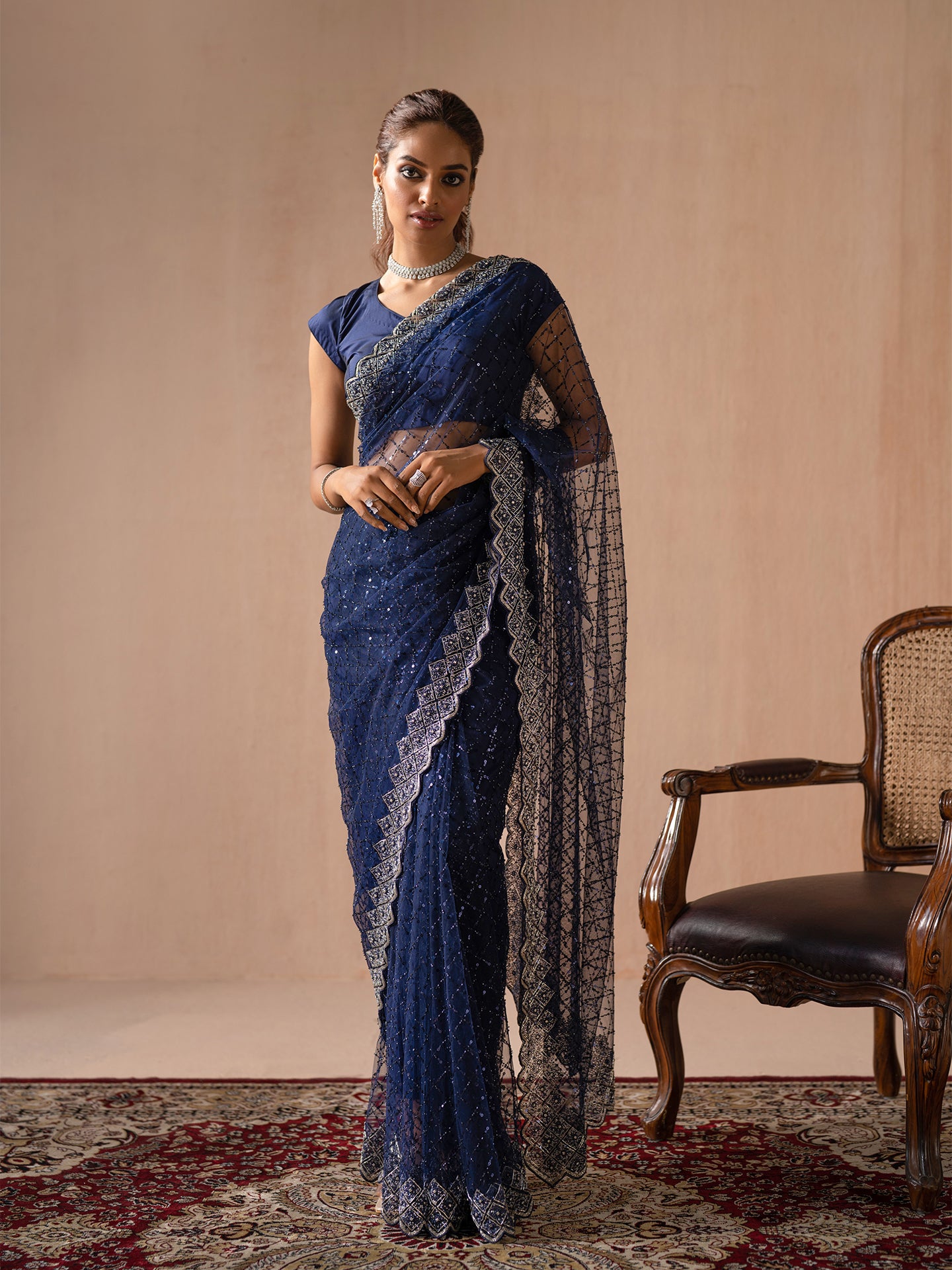- - This gorgeous saree is a masterpiece and one of a kind saree . The inticrate kardana work adds so much beauty in this saree , making it surreal . Whereas , sequin work is adding a little spark in this saree which makes it ultimate choice for post wedding events .