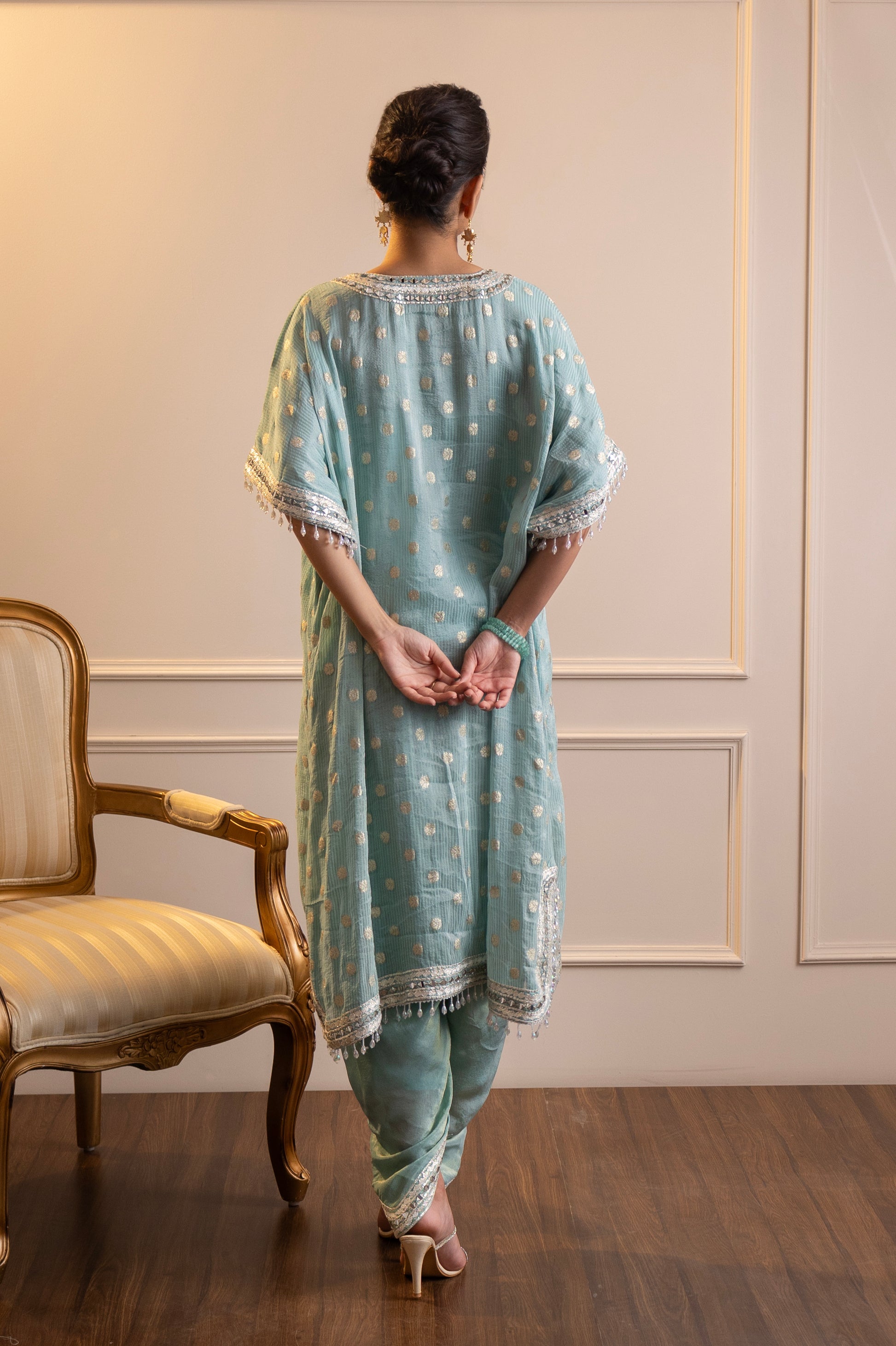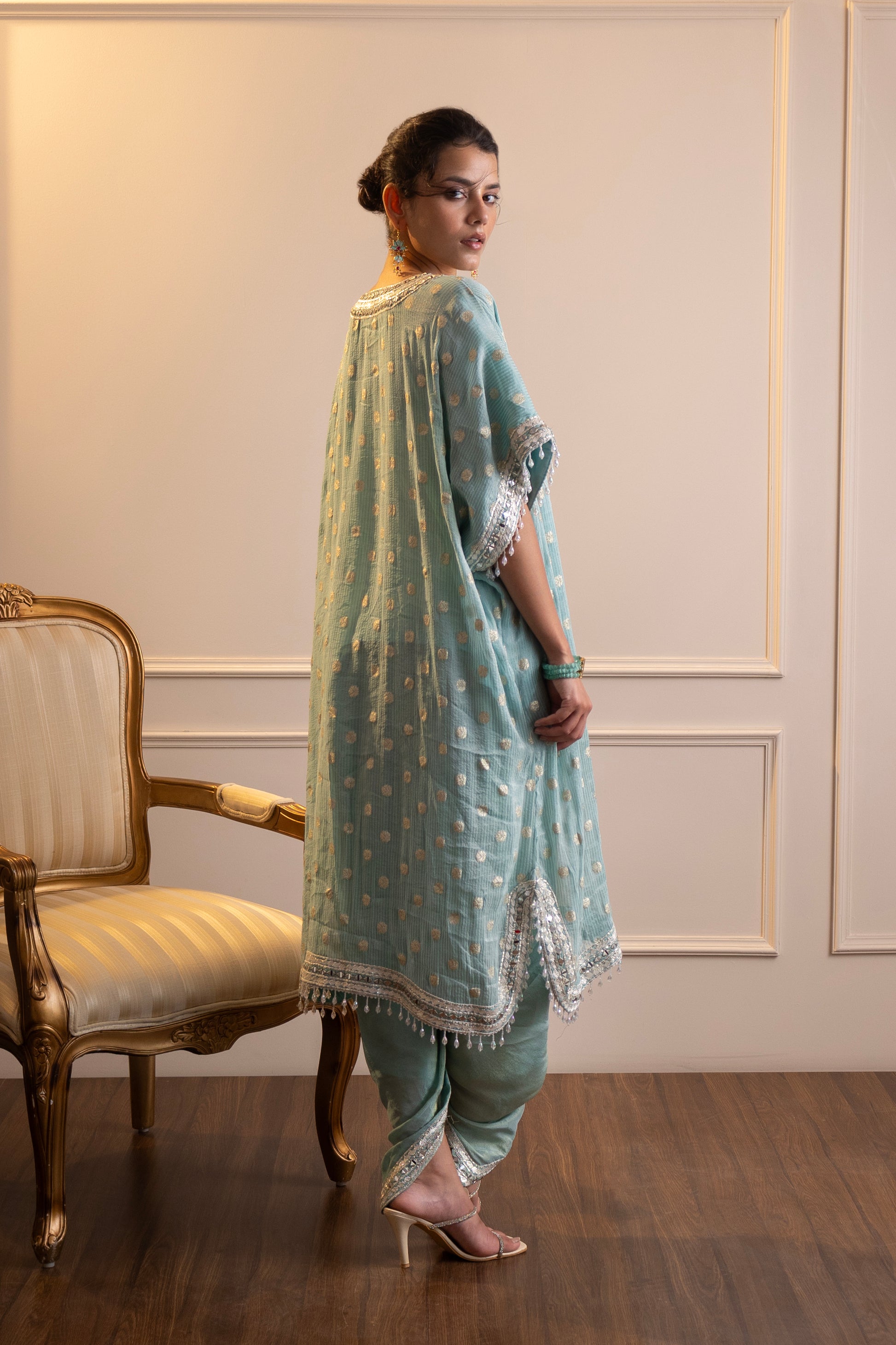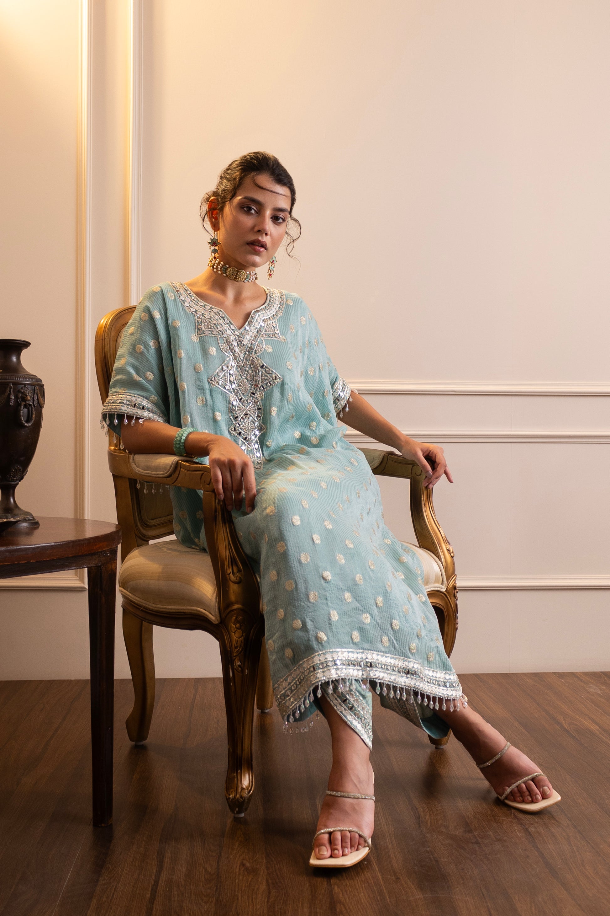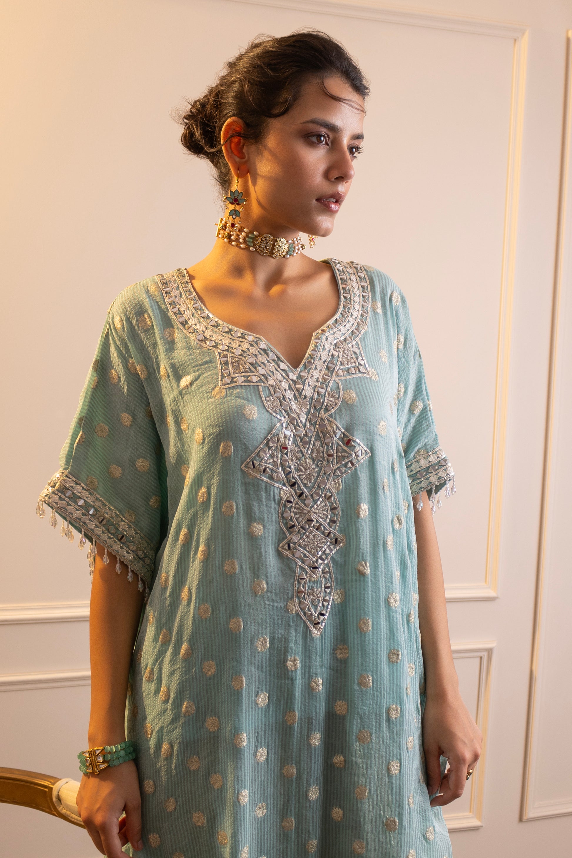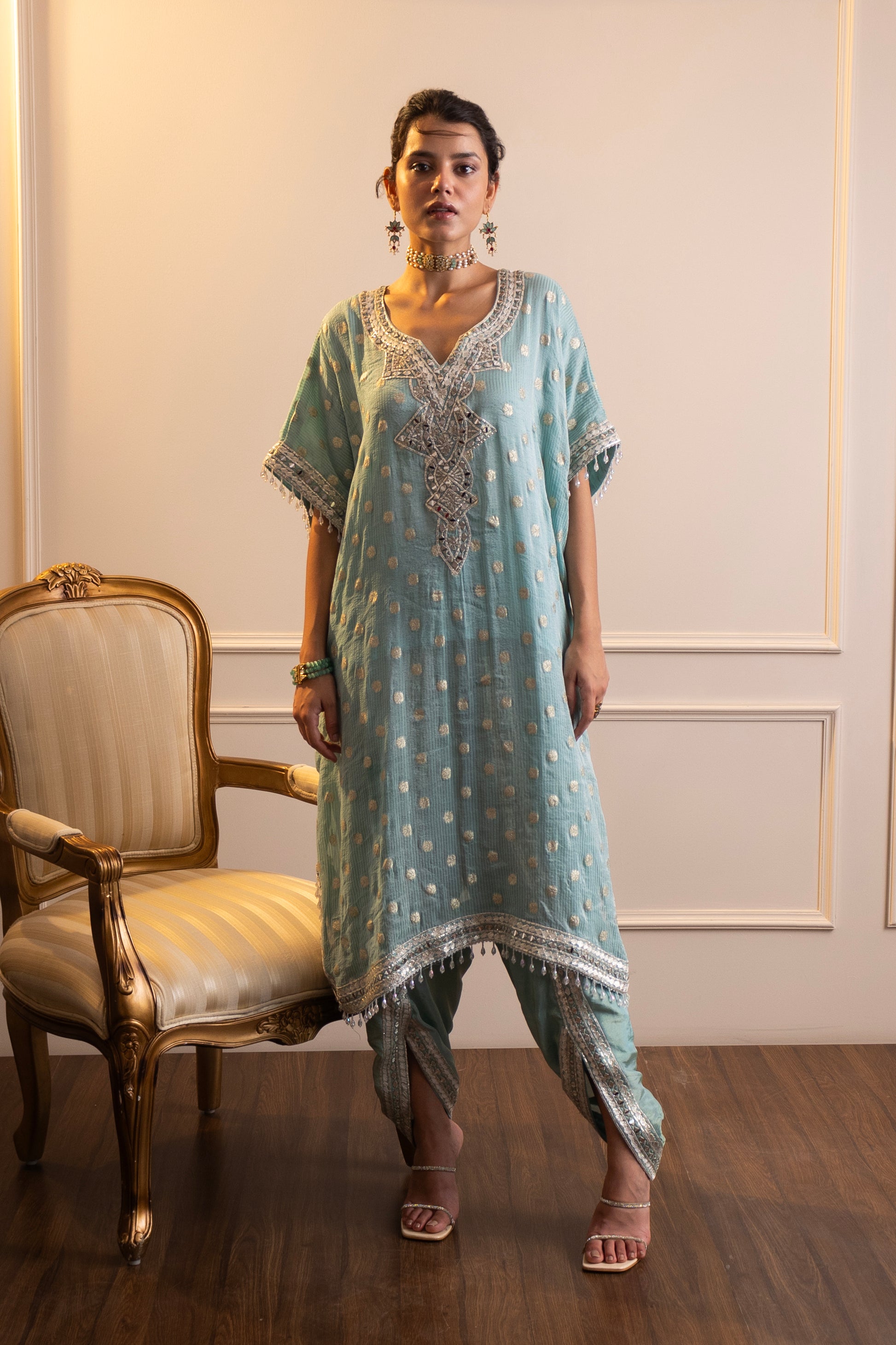 - - Step into elegance with this stunning kaftan and pant set! Featuring intricate gotta patti and mirror work, this outfit adds the perfect touch of sparkle. Made from rich modal silk, it offers both comfort and luxury.Whether it's a festive occasion or a casual day out, this ensemble is a flawless blend of tradition and modern style!