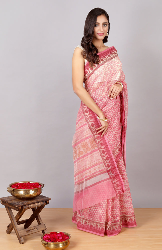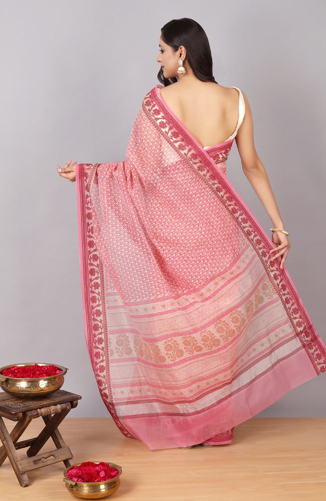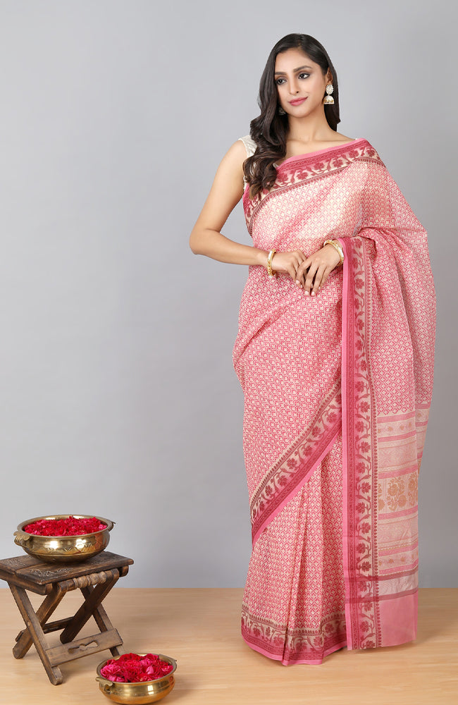 - - Handwoven, summery, and simple, our block printed pink cotton kota or kota doriya, makes for the perfect choice for when you want to keep things classic, but also chic. Because we believe tradition is something that never goes out of style.